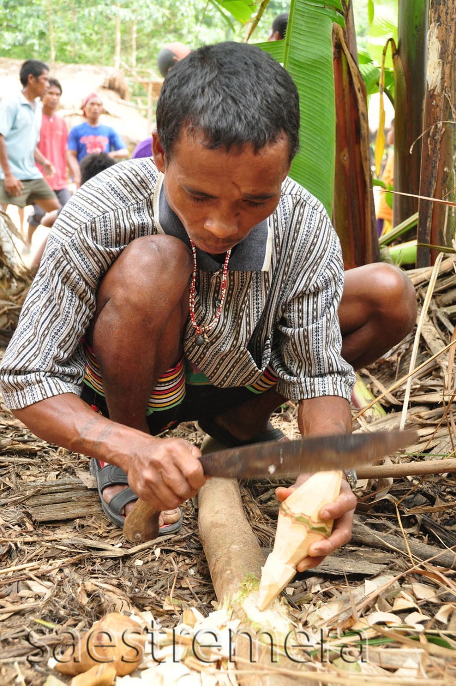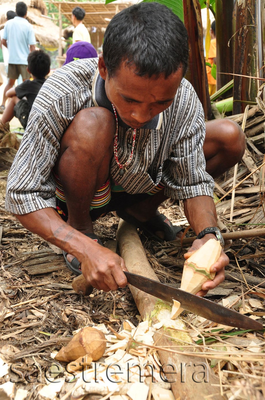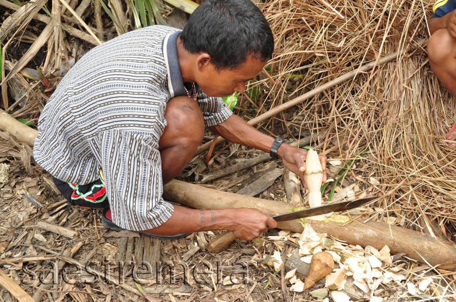 Menfolk make tops. Big tops. Out of food. They use their bolos to make these. They chopped off a branch and then cut out a top; from the round top to the bottom spike, all from one wood.