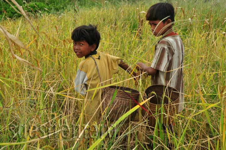 Upland rice is harvested by hand, stalk per stalk.
