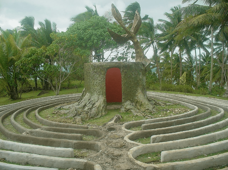 And beyond a few meters away from the main shrine of the Cosmic Healing Christ with the heart of the child we have the so-called Daub-Alim because during our retreats we have this ritual of burning our sins as a way of purifying ourselves and then we have the symbol of fire again with the people sitting around the fire and then there’s the ritual we have… so we have it also the work of Kublai in terms of the fires of healing. And the lower part of the shrine there’s a so called Panaw-Alim, I mean to say, I told Kublai of the eight stages in life where we move up or we go back and at the very heart of the … the very center of the eight stages of life is the very core of who we are. So there’s a big stone buried there, flat where we can meditate for a while. There is that round structure where you go inside and above it again the imagery of a new leaf sprouting… meaning to say that as you’d like to reach our center we must learn to leave behind all the hurts, we get hurt in every stage of our lives to become mature but then to be able to heal ourselves back to anoint ourselves back to who we are, core of ourselves, then we have to let go of our woundedness our hurts our disappointments and allow the inner person, the very core of a person to be healed by God.