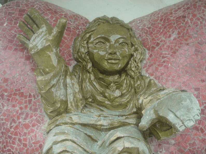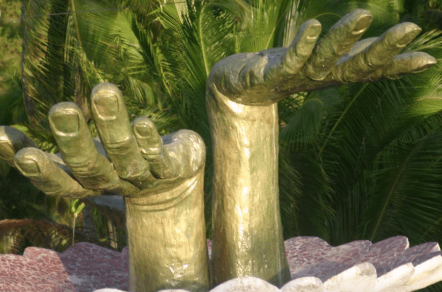 And then we requested Kublai to also sculpt for us the entrance. An architect friend of mine actually designed the entrance, but Kublai added the image of Mother Earth welcoming everybody coming from the steps below. And also that as we approach the shrine I told Kublai that we would like to have family as the center of the healing process and of course we have the hands as symbols of healing, and in fact at the highway there’s a signage where there is a hand with the wound of Christ or the wound of the hand but there’s a vine going through the wounds and then climbing up and blossoming. Meaning to say that our woundedness can be our source of life again. And then as we go up we are embraced by Mother Nature, welcomed by Mother Nature and then as we approach the shrine, going to a few steps going to the ground we have the three hands of the father, the mother and the child. The child with a water flowing meaning to say that actually the healing should start with the family in the hands of the mother and the father and of course the children. So that’s it.